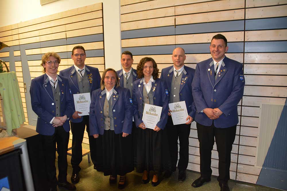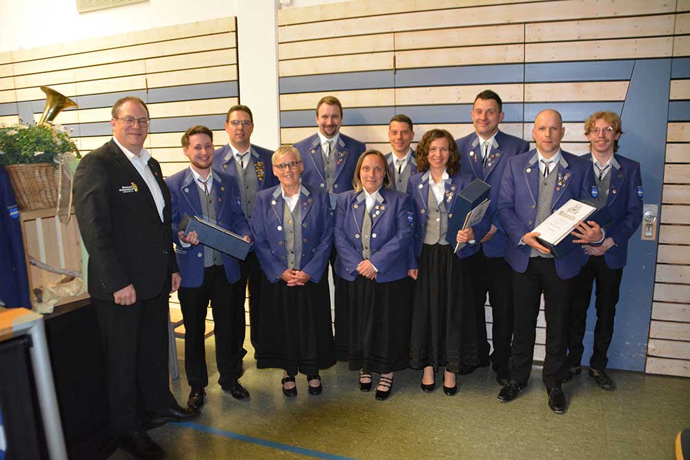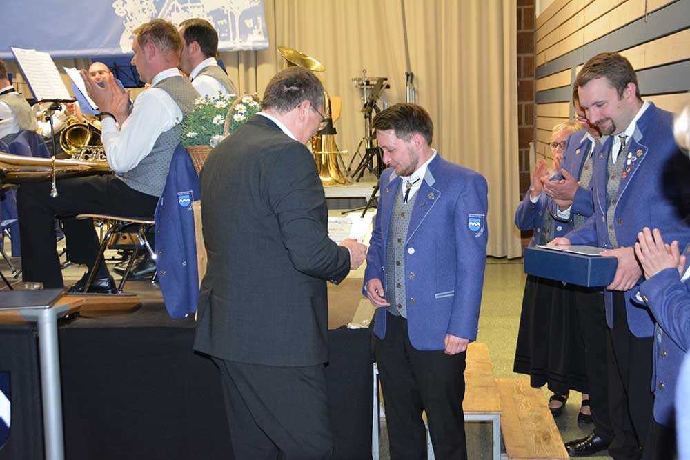 Die anschließenden Ehrungen wurden von Thorsten Hellstern, stellvertretender Vorsitzender des Kreisverbandes Zollernalb, vorgenommen. Paul Nast wurde für seine 10-jährige aktive Mitgliedschaft im Musikverein geehrt. Niko Schuler und Larissa Grüner erhielten die Fördernadel in Bronze für 10-jährige Tätigkeit im Verein. Für 15-jährige Tätigkeit im Verein wurden Alexander Heimann und Jürgen Merz geehrt. Die Fördernadel in Gold erhielt Jörg Berbalk für 20-jährige Tätigkeit im Verein.