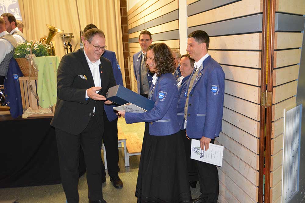 Musikalisch ging es dann wieder weiter mit der Aktivenkapelle. Mit viel Schwung präsentierten sich die Musiker noch einmal. Bei der “Bodensee-Polka” glänzten die Tenorhorn-Solisten und zeigten ihr Können.